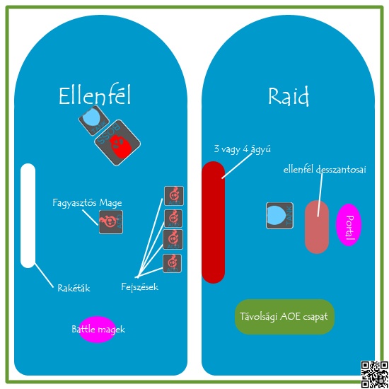 A fenti térkép elég szépen bemutatja a csata menetét is. A hajók egymás mellé kerülnek és megcsáklyázzák egymást, ezzel indul az egész. A támadó hajó (a mienk) oldalán van egy sor ágyú (hogy három vagy négy még kérdéses), ezekkel tudjuk eldönteni a csatát, szét kell lőni annyira az ellenfél hajóját, hogy elbukdácsoljon. Persze ugyanez velünk is megtörténhet a védekező hajó távolabbi oldalán egy sor rakétás van, akik a mi hajónkat igyekeznek szétlőni. Az ágyuinkkal szemben Axe Throwerek sorakoznak akiket ki kell csinálni gyorsan. Hátuk mögött az ellenfél kapitánya és a két battle mage akik portálokat tartanak fenn. Az egyik portálból az elhullt NPC utánpótlás jön, a másik portál a mi hajónkra van nyitva és azon keresztül támadnak. Összefoglalva a dolgot két csoportra kell oszlani. Védekezők A védekező csapat feladata az ágyúk kezelése és védelme. A saját hajójukon maradnak és mind távolsági dps kell hogy legyen, két healerrel és egy tankkal. A térképen látható módon felállnak, a tank feltartja az addokat, a dps lelövi, a heal meg igyekszik életben tartani a megviselt tankot. A csata kezdetén a védekező hajóról még nincs portál, így ilyenkor a ranged dolga hogy besegít az Axe Throwerek ritkításában. Figyelem! Végig a csata folyamán a másik hajóról rakétákkal lőni fogják a védekezőket is. Hogy hova érkezik rakéta arról egy kis kereszt ad jelt a földön. Ki kell belőle állni. A támadók A támadók között nagyon erős single target és közelharci dpseknek kell lenniük. A feladatuk, hogy használva a Jetpacket átugrálnak az ellenfél hajójára és takarítják az Axe throwereket, ölik a rakétásokat és a tank tartja a bosst. Két healer kell rá, 1 tank és minden közelharci dps. Mikor a tankon túl sok a debuff vissza kell mennie a saját hajójára hogy lejárjon róla. Gondolom ilyenkor a dps is visszaugrik egyébként szétverné őket a boss, de ez nem biztos. :) A csata addig tart míg az egyik hajó elég sebzést nem kap ahhoz hogy fel kelljen adnia a küzdelmet és elmenekül. http://www.youtube.com/watch?v=njMr2JpinWk | |